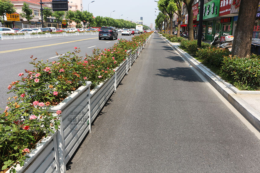 道路隔離花箱可分為中央隔離花箱、機非隔離花箱。這里就是機非隔離花箱。